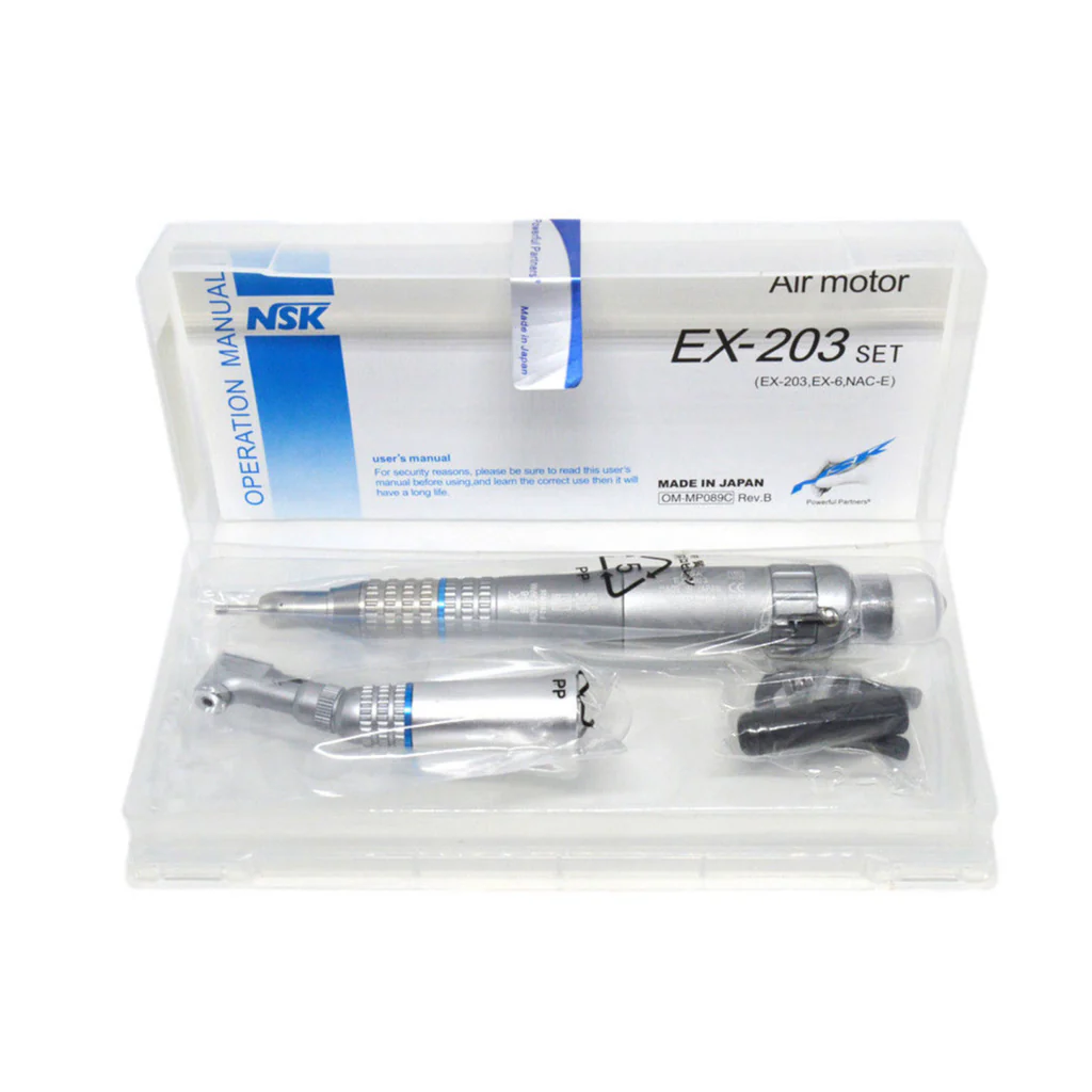 The NSK Air Motor EX-203 is a quiet, low-vibration, ISO E-Type air motor designed for dental slow-speed handpieces, featuring forward/reverse control and a quick-release attachment system compatible with various E-Type attachments. It provides stable operation for polishing, caries removal, and prosthetic adjustment, is autoclavable, and typically operates with a 1:1 direct drive ratio.